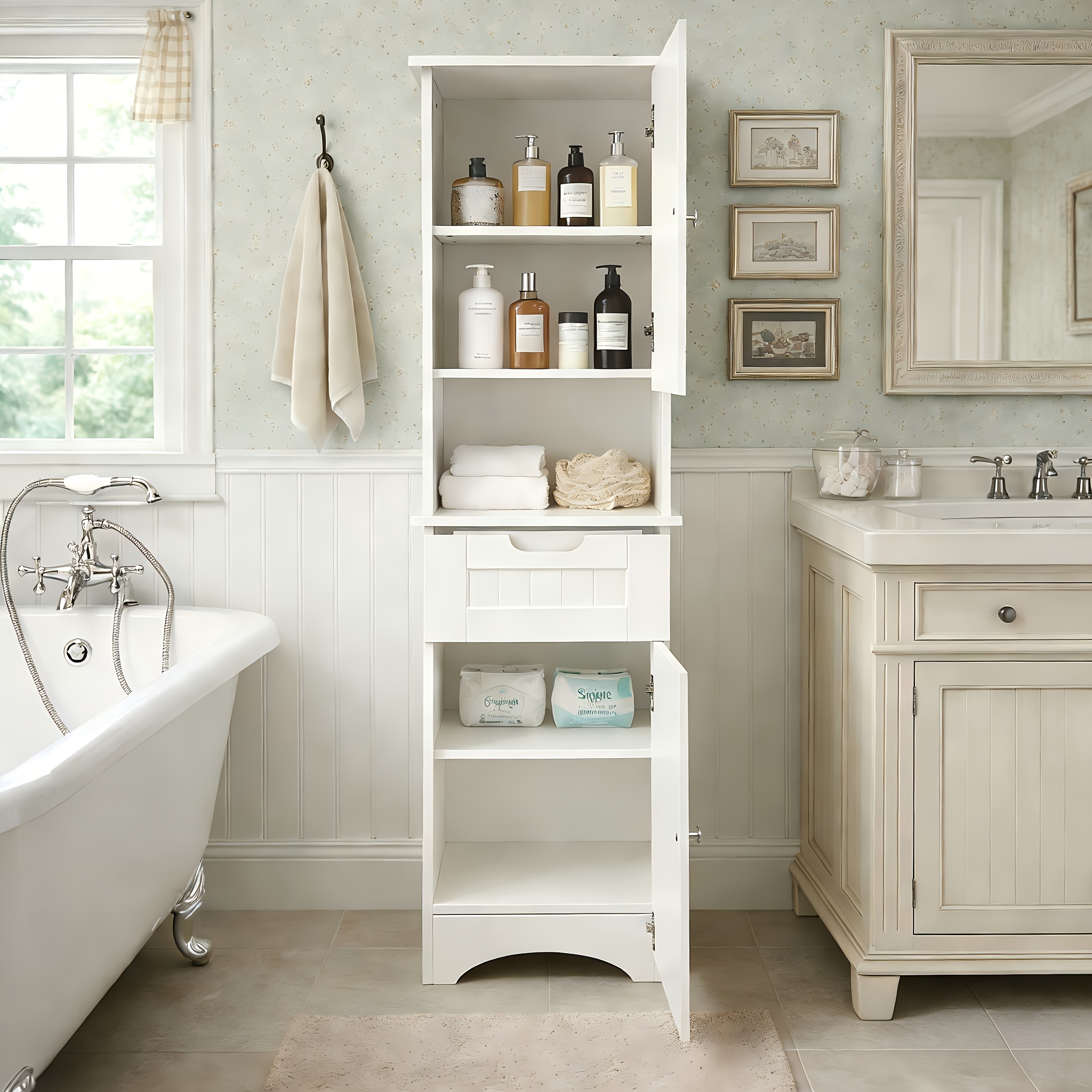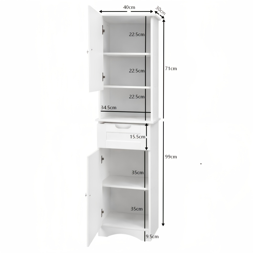 A Slender, Vertical Storage Unit for The Bathroom, Featuring Two Doors, a Drawer, And Open Shelving, Designed in a White Farmhouse Aesthetic, Suitable for The Bathroom, Laundry Area, Entryway, Or Study