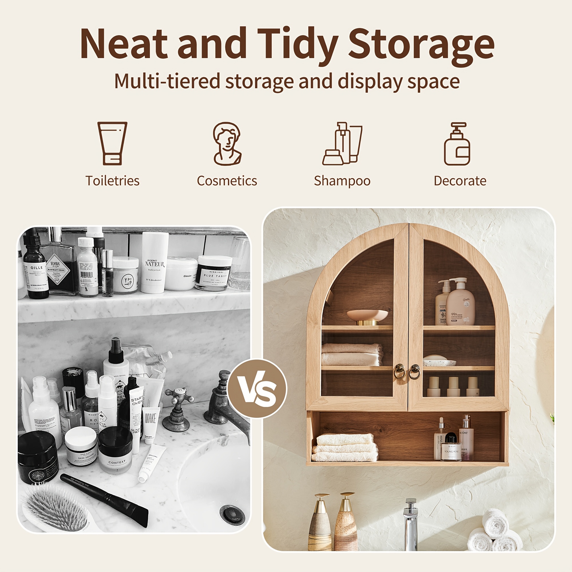 Arched Medicine Cabinet Suitable for Over the Toilet Storage - Modern Wall-Mounted Bathroom Cabinet with Adjustable Shelves, Double Door Arched Top, Wood, Engineered Wood for Laundry Room Organization