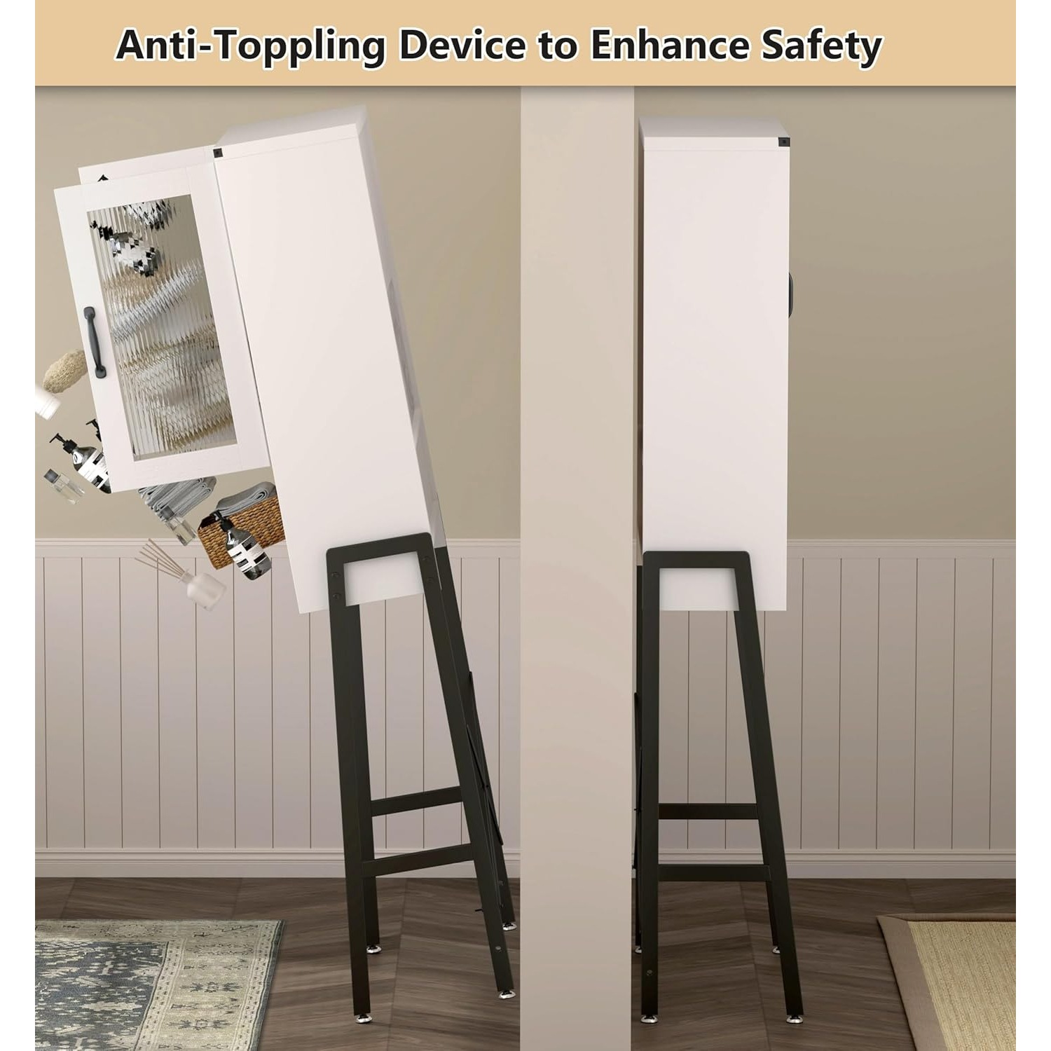 Optimize The Space in Your Bathroom! A Tall, Standalone Toilet Storage Cabinet Featuring Tempered Glass Doors And a Robust Metal Frame. It Is Adjustable And Easy to Assemble